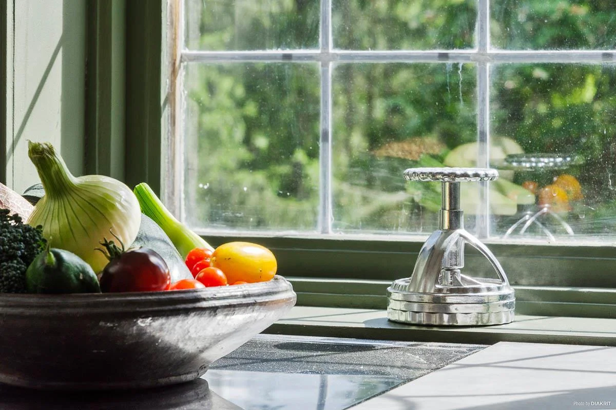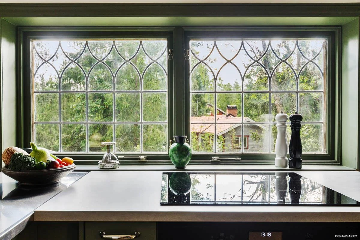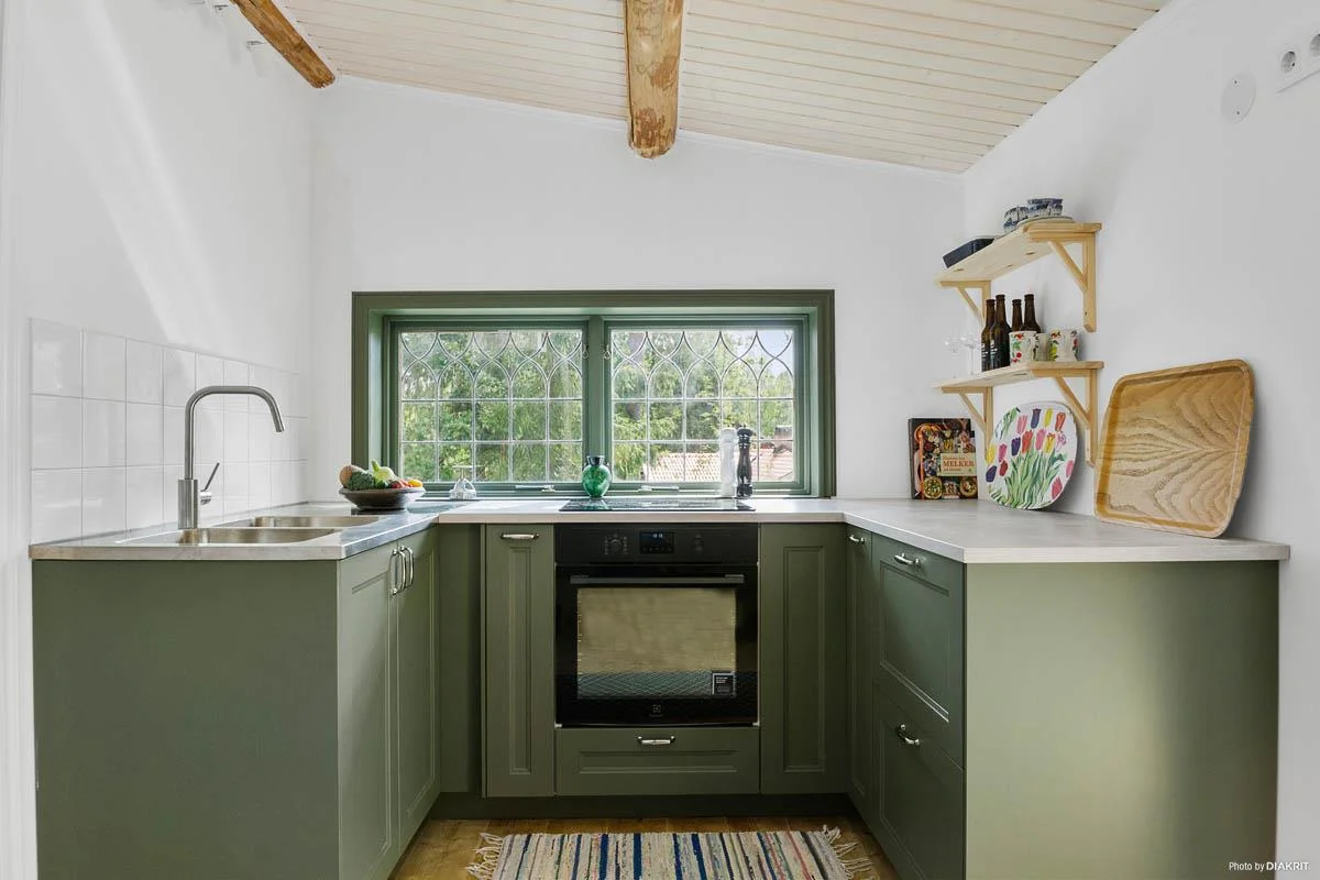 Köket är modernt och utformat i ett praktiskt U, med gott om arbetsytor och förvaring. Den mörkgröna kulören återkommer även här, och två vackert blyinfattade fönster släpper in ett behagligt ljus. Köket är utrustat med spishäll, ugn samt kyl/frys i halvhöjd.