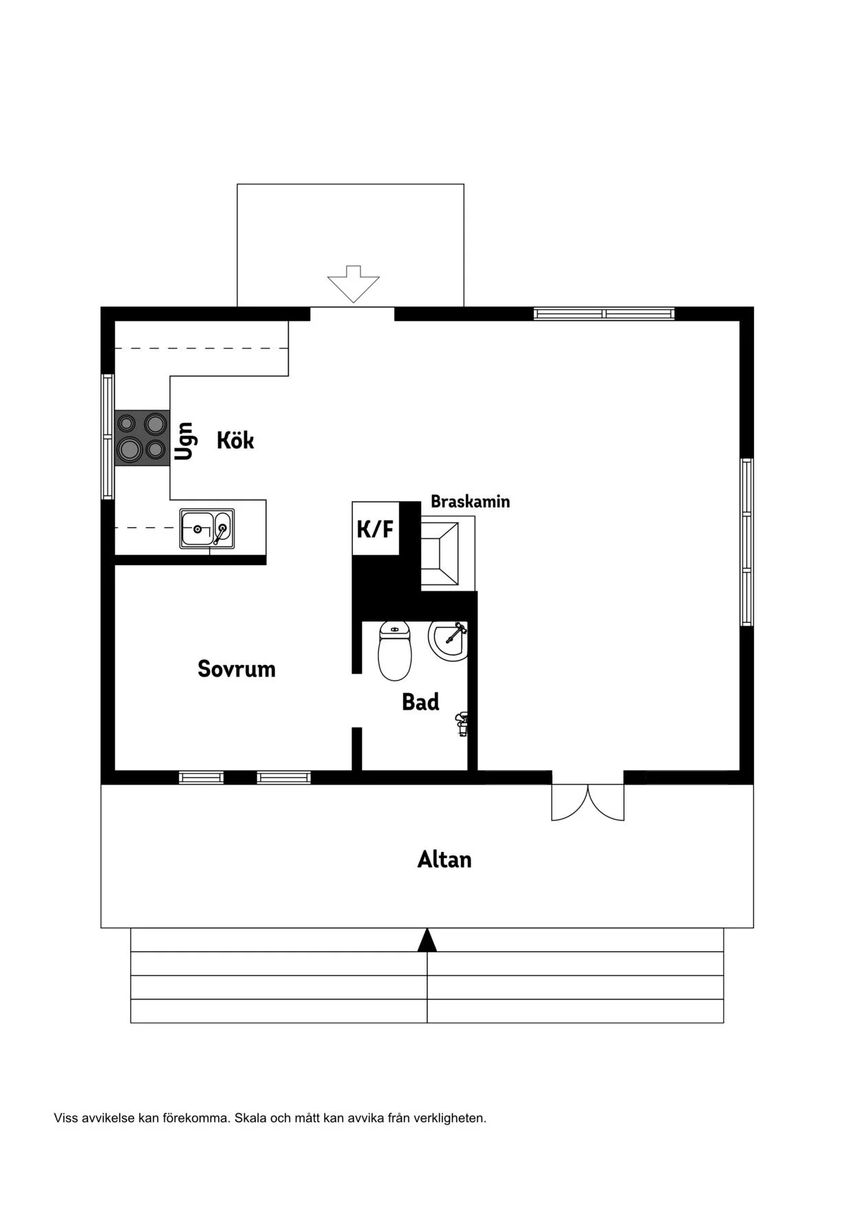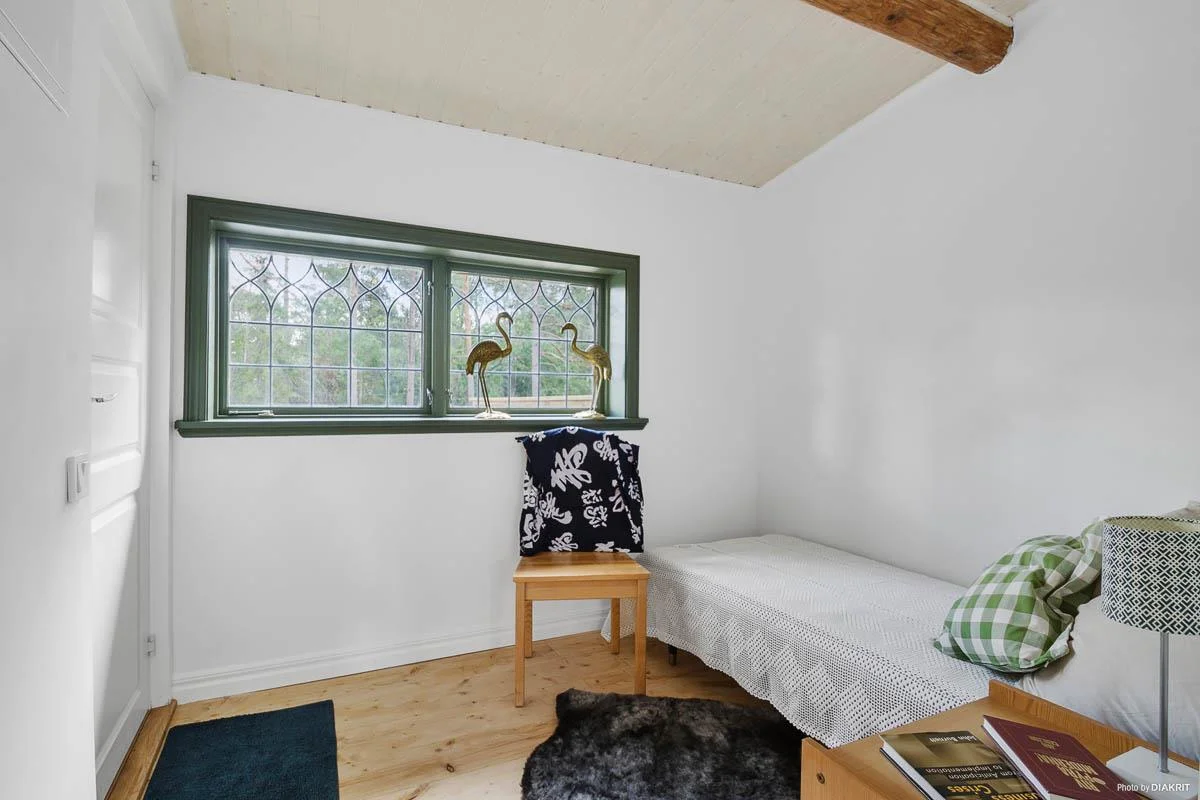 Själva huset är cirka 33 kvm och fördelat på två rum och kök. Direkt innanför entrén möts ni av en hall med plats för avhängning. Interiören präglas av vitmålade väggar, charmiga djupa fönsternischer i mörkgrönt, blyinfattade fönster, synliga takbjälkar och ljusa trägolv – en smakfull kombination som skapar en varm och välkomnande känsla.