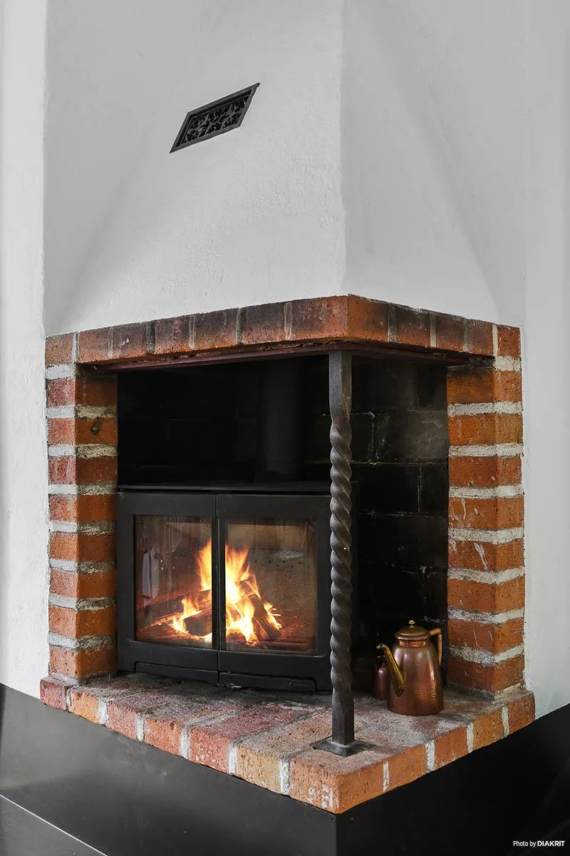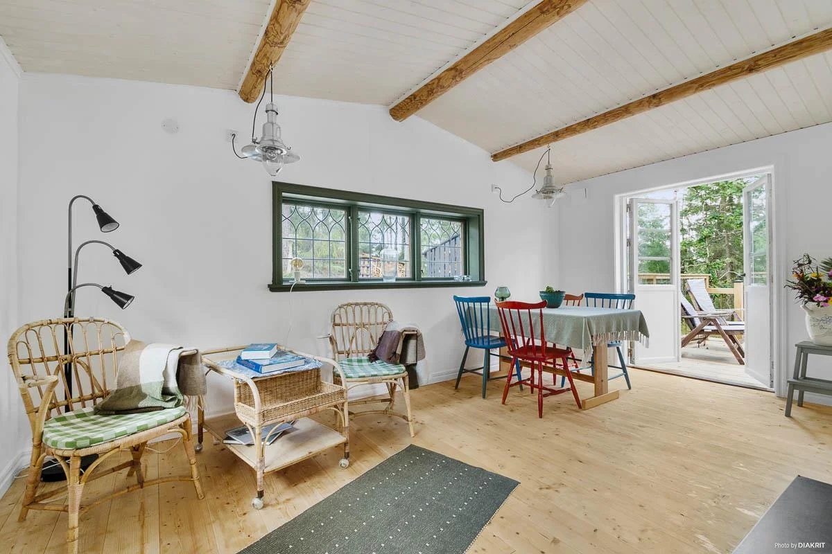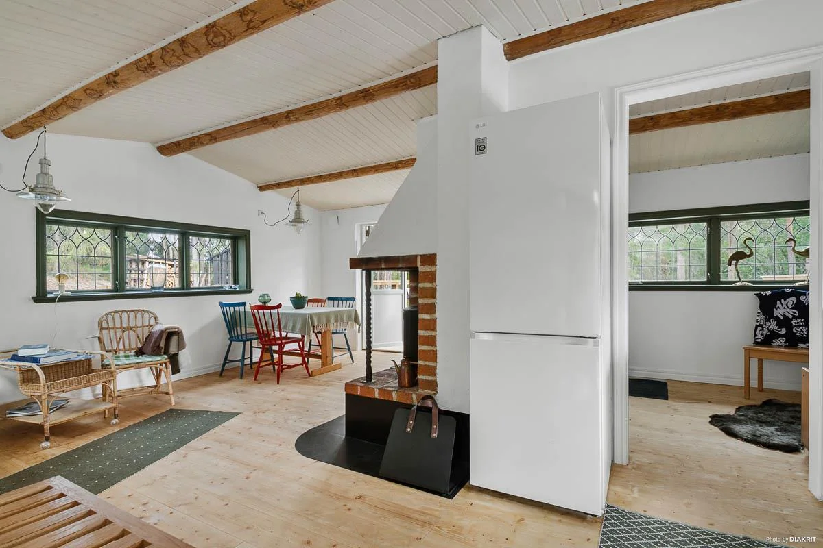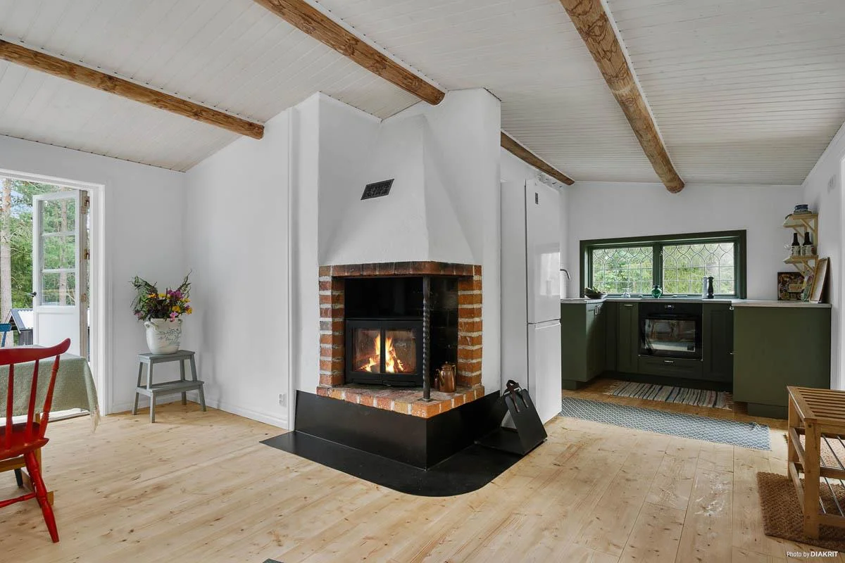 Vardagsrummet ligger i vinkel från köket och har en öppen spis med braskamin – perfekt för mysiga kvällar året runt. Kaminens placering gör att hela huset kan värmas upp effektivt även under årets kallare månader. Utöver braskaminen sitter en luft/luftvärmepump strategiskt placerad på gavelsidan i vardagsrummet och sprider värme i huset. Här finns gott om plats för både soffgrupp och matplats. Från vardagsrummet leder dubbla glasdörrar direkt ut till den trädäckade altanen på husets baksida – en härlig plats för avkoppling eller sociala tillställningar.