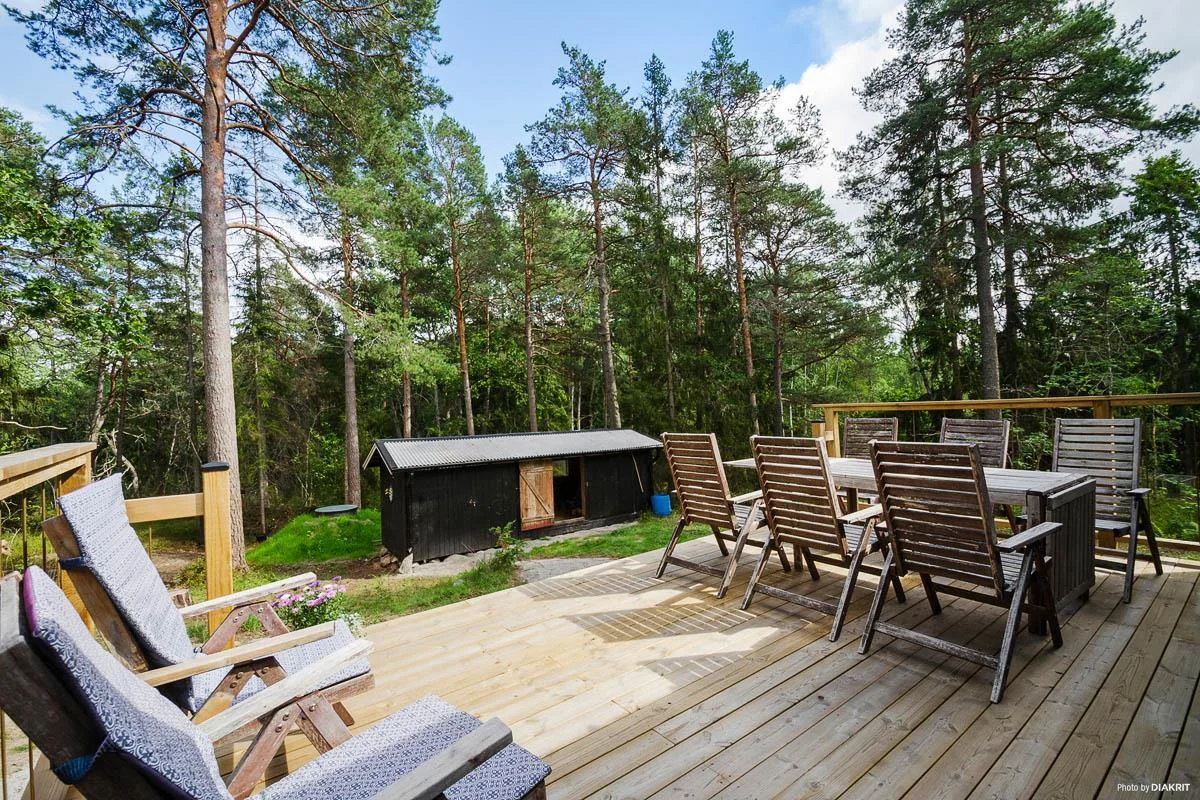Tomten är generös och varierad, med både plana ytor, vackra planteringar och inslag av naturtomt med bergsknallar – en perfekt balans mellan trädgård och orörd natur. Här finns även en tillhörande förrådsbyggnad samt vedförråd. Parkeringsmöjligheterna är goda, med plats för flera bilar samt elstolpe med möjlighet till elbilsladdning.