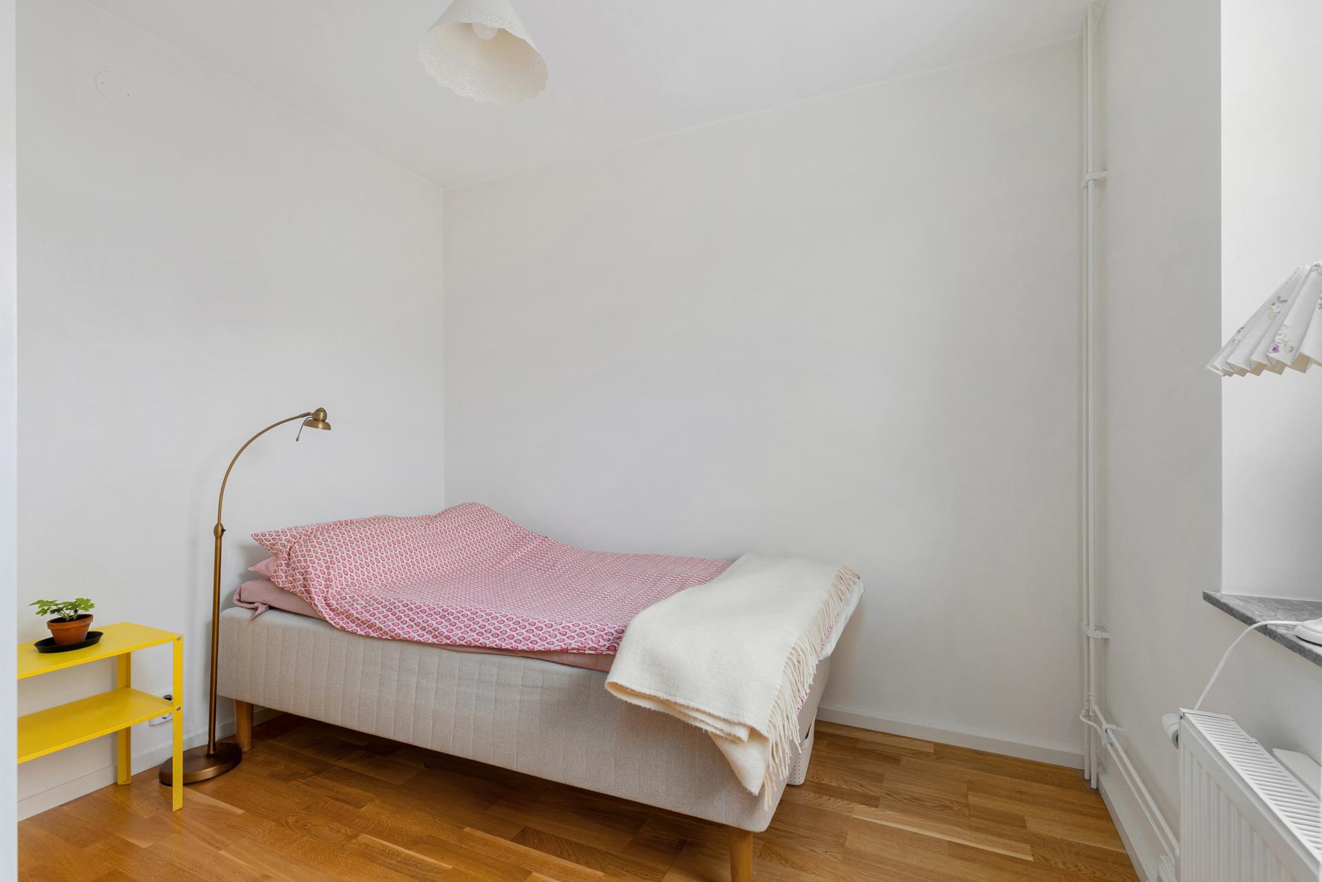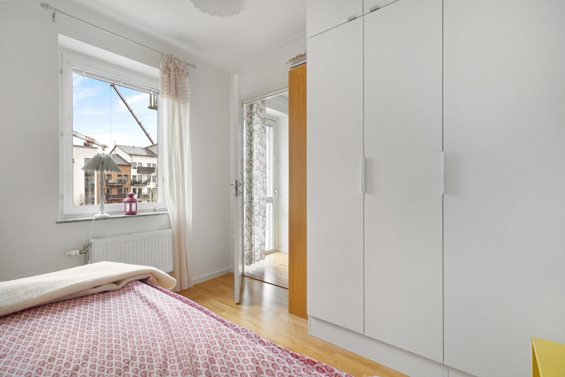 Rejält sovrum med garderobsförvaring och plats för större säng. Skulle garderoberna flyttas så finns utrymme för en fullstor dubbelsäng.