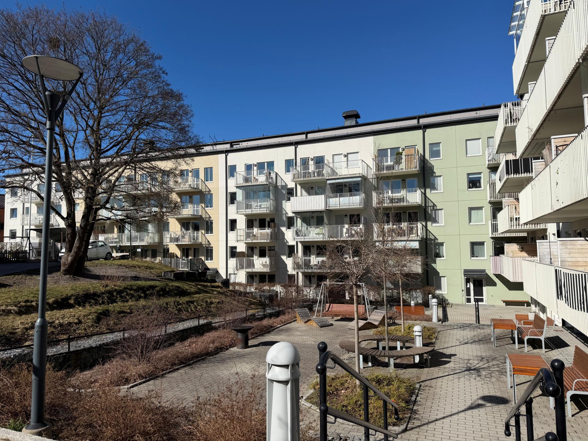 På Chamottevägen 15 finner ni denna välplanerade 2:a, belägen högt upp i huset med en rymlig balkong i soligt söderläge och vy över den harmoniska innergården. Balkongen rymmer loungemöbler och bjuder in till avkopplande stunder utomhus.