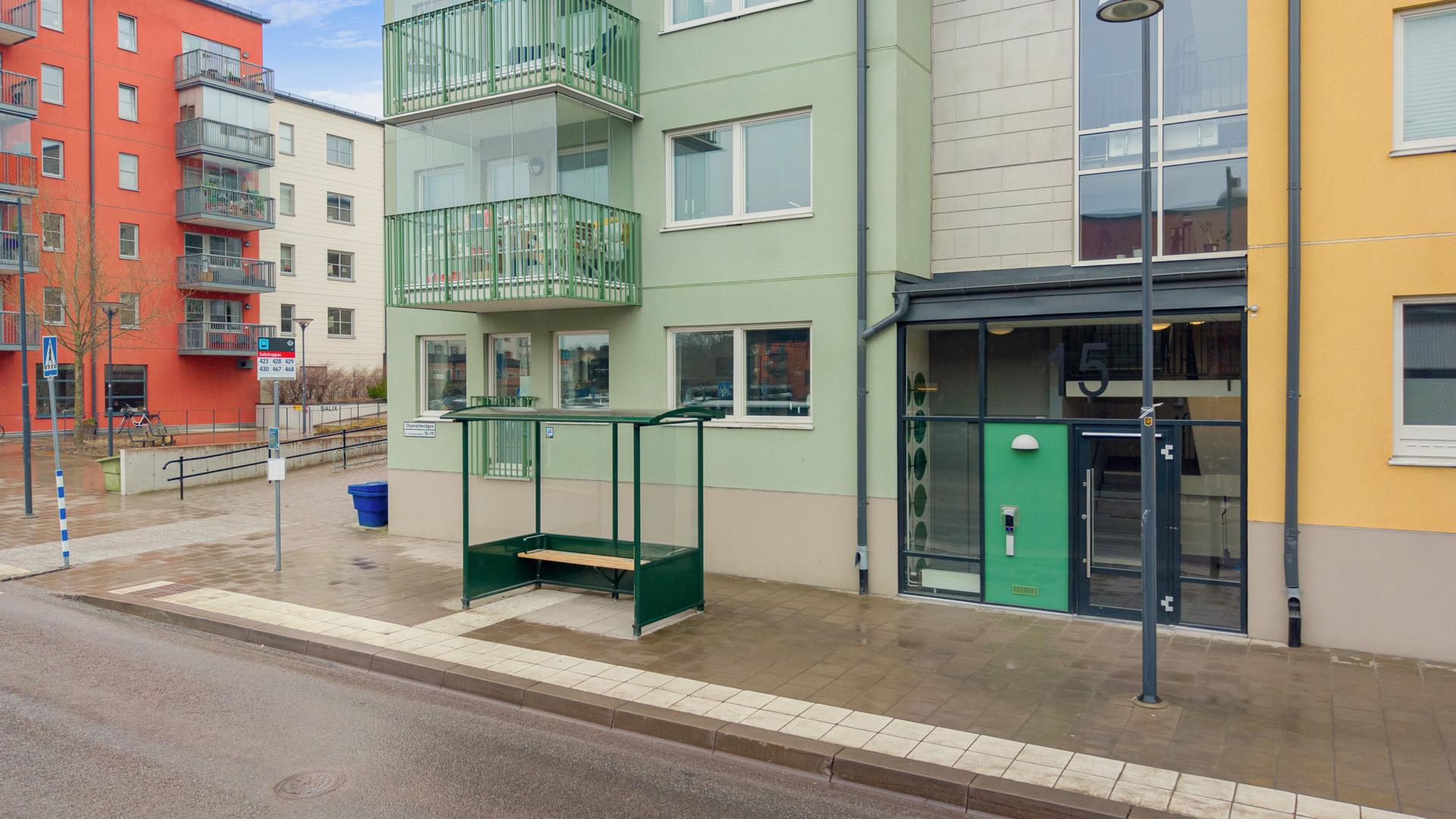 I närheten av föreningens byggnader ligger Blå Blom-parken med trevlig lekplats och Fajansparken med fina parkstråk som löper genom hela Porslinskvarteren. Busshållplatsen till direktbussarna som tar dig smidigt in till Slussen eller Cityterminalen på bara 25 min finns på kort promenadavstånd. Under sommarhalvåret kan man även åka båt till/från Slussen. Det historiska gamla fabriksområdet är en levande stadsdel där fabrikens historia är synlig för invånare och besökare då industriarkitekturen bevarats. I Gustavsbergs Hamn, ett par minuters promenad från lägenheten finns matbutik, vårdcentral, kulturhus, småbutiker, café, restauranger och flertal outlets med glas, keramik och porslin. Ytterligare några minuter bort finns Gustavsbergs Centrum och de större köpcentrumen Värmdö marknad och Värmdö Köpcentrum med ett 70-tal butiker. Vid Gustavsbergs centrum som är knutpunkten med sin bussterminal finner du idag bland annat matbutik, blomster och presentbutik, skönhetsvård, bibliotek, bio och teater, apotek, gym, systembolag och även äventyrsbadet - Gustavsbergsbadet och flera andra idrottsanläggningar.