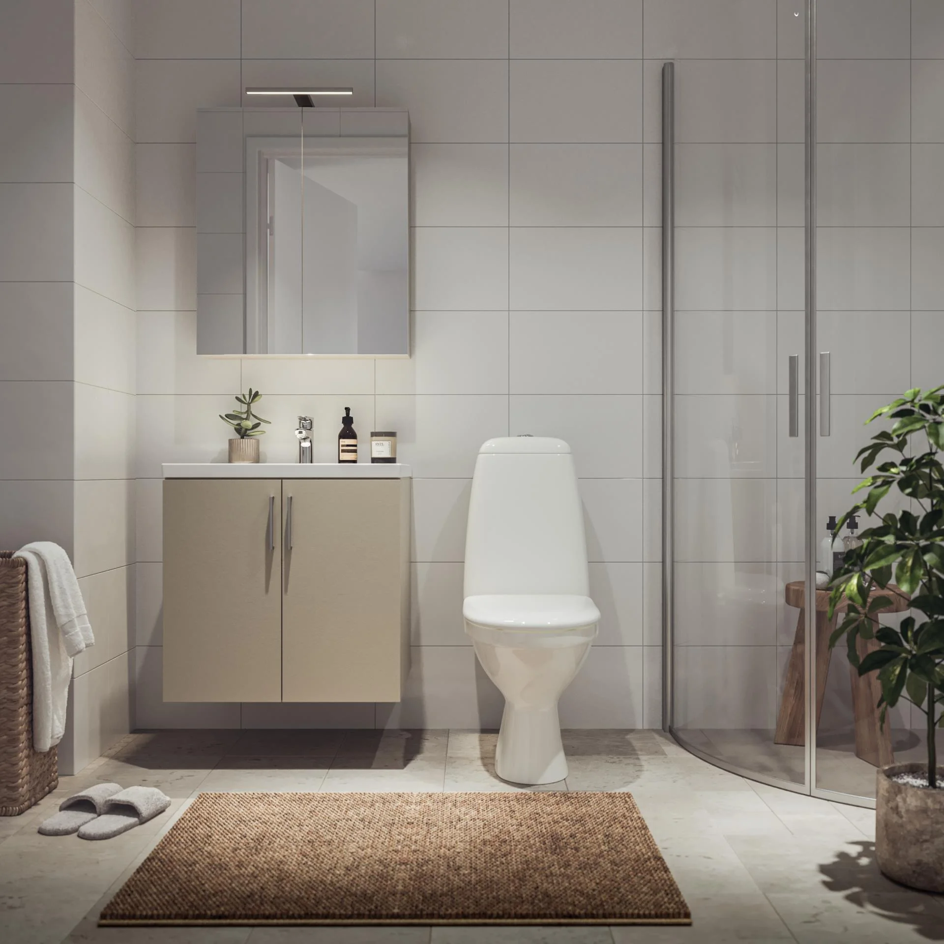 De två badrummen är helkaklade i tidlösa toner. På entréplanet finns dusch, wc, kommod och spegel. På övre plan finns ett ytterligare badrum med duschväggar i klarglas, wc, kommod samt en praktisk kombimaskin för tvätt och tork.
